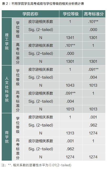 為了解學生高考成績與學位等級之間的相關性是否會受學科專業的影響,本研究根據學科專業對所有學生進行了分組。N大學共有3個學院,即理工學院、人文社科學院、商學院,本研究按照學院將全部學生相應分成3個組,并分別分析不同學院學生的高考總成績與學位等級之間的相關性。由表2可知,在理工學院和人文社科學院的學生中,高考成績與學位等級這兩個變量之間的P值都小于0.05,兩個變量之間有顯著的正相關關系;在商學院的學生中,高考成績與學位等級這兩個變量之間的P值大于0.05,說明這兩個變量之間沒有顯著相關性。