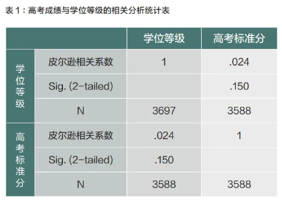 中外合作大學由于實行全英文教學,為了防止學生在學習期間難以適應,各校在招生時一般都會對高考英語的單科成績有所要求。為了解學生的高考英語成績是否會對其最終所取得的學位等級有影響,本研究用皮爾遜相關系數法檢測了這兩個變量之間的關系(見表3),得到P值小于0.05,兩個變量之間有顯著的正相關關系。這一研究結果與相關領域已有的研究結論相吻合,如國際數學與科學學習趨勢研究(TIMSS)2015年的大數據調查顯示,學生的家庭語言與教學考試語言的一致性是學生學業成績的重要影響因素之一[1]。本研究中所有學生皆為中國學生,其家庭語言與英語有很大差異,因此學生英語能力的高低必然會對學業成績產生影響,而上述研究結論也印證了這一假設。