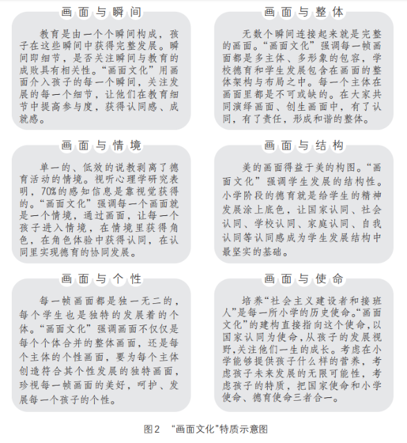 二是提煉出“畫面文化”及其育人特質(zhì),完成文化對德育體系的整體浸潤。利用直觀、形象的畫面進行德育,更符合小學(xué)生心理特征與認(rèn)知規(guī)律,更容易讓德育入情入境入腦入心。為此,學(xué)校從影視資源等育人元素中提煉出“畫面文化”,用文化增強育人的包容性,將德育工作植入學(xué)校發(fā)展核心,使德育工作融入學(xué)校工作的方方面面,增強德育的整體性(見圖2)。