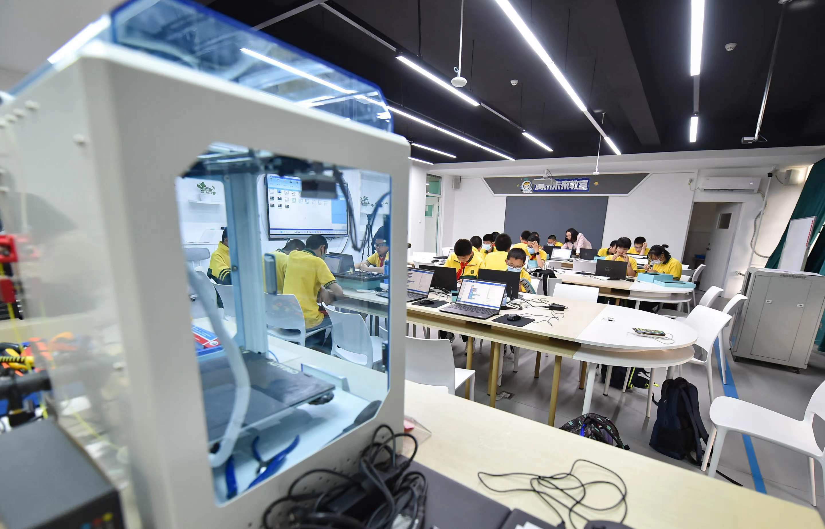 該校執(zhí)行校長王強介紹,目前,未來教室除了承載小學、初中、高中學生的一些常規(guī)課程外,還開設有3D打印、人工智能、計算機編程等豐富的興趣類課程,“這是我們學校使用頻率最高,也最受歡迎的一間教室”。