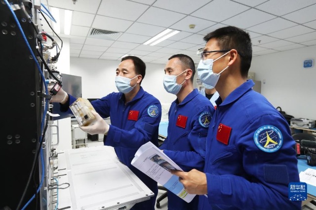 神舟十六號航天員乘組在人船合練中交流(2022年9月23日攝)。新華社發(徐部 攝)