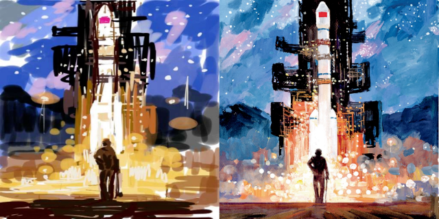 《孫家棟》第43幅草圖(左)與成稿(右) 人民美術出版社供圖