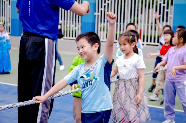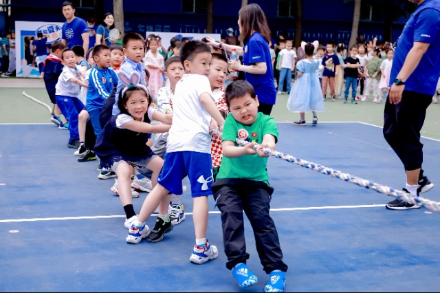 本次活動還在東小操場設置了團體活動體驗項目的分會場,孩子們在這里能體驗年級拔河比賽、鼓圈文化等項目。