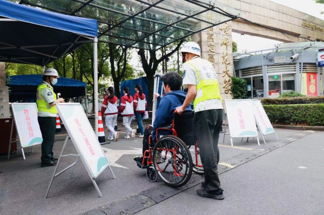 在上海師范大學(xué)附屬嘉定高級(jí)中學(xué)考點(diǎn),一位校園保安師傅推著坐輪椅的考生進(jìn)入考點(diǎn)。鄭曉眉 攝