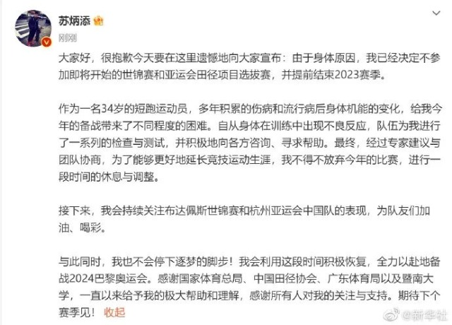 6月12日,@蘇炳添 微博宣布,由于身體原因,已經決定不參加即將開始的田徑世錦賽和亞運會田徑項目選拔賽,并提前結束2023賽季。蘇炳添說,會利用這段時間積極恢復,全力以赴地備戰2024巴黎奧運會。