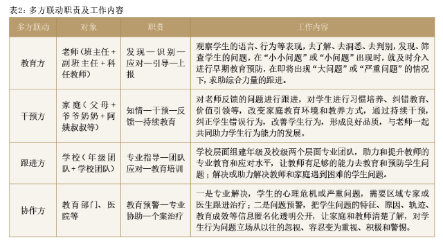 基于學生視角,以更適切學生成長規律、貼近學生內心的教育方式,對學生問題進行科學有效的引領預防和教育,需要改變教師單方應對的單一方式,策略性尋求各方教育力量,形成全域視野下的家庭、教師、學校及教育部門共同參與的“多方聯動”體系,著力于學生行為問題的識別及學生問題預防機制建設,引領學生健康成長。