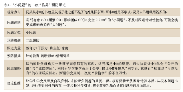 因學生個性習慣、認識不足、不恰當需求或同伴影響等引發的“小問題”,需要通過引領學生正向行為、隔斷負面影響和消解消極情緒等,避免類似問題再次發生(見表4)。
