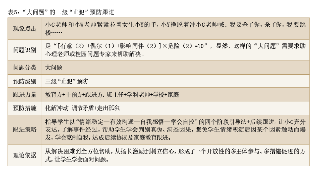 學生情緒積累到一定程度達到爆發的臨界點,在“大問題”即將發生或者發生初期,及時化解學生沖動行為,引領學生調節內心矛盾,消除問題情緒積累(見表5)。