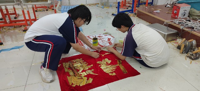 濟南高新區雅文學校校長楊其山介紹,麥稈畫是利用麥稈的光澤屬性,經過采集、蒸餾、浸泡、熨燙、刮皮、粘貼、烙邊、裝裱等十幾道工序,精心加工制作而成。為了培養雅文學子熱愛勞動的美好品行,學校開發了麥稈畫課程。