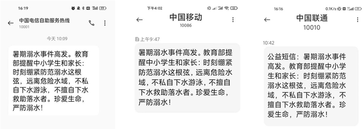 據悉,為貫徹落實習近平總書記關于防汛救災工作的重要指示精神,教育部商請工信部集中發送了上述防溺水公益短信,宣傳普及防溺水安全知識,提醒廣大中小學生和家長增強安全意識,營造全社會關心支持預防學生溺水工作良好氛圍。