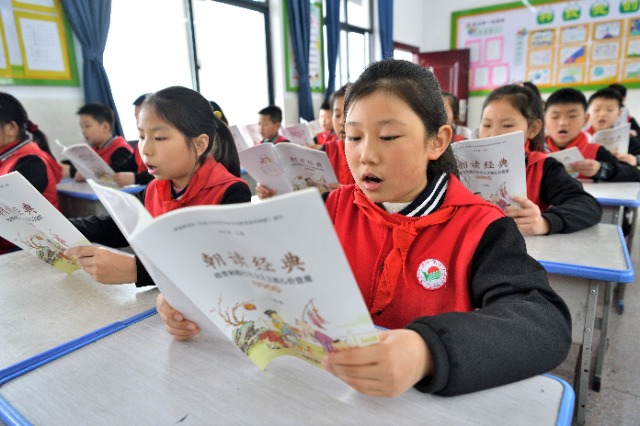 4月20日,湖北省襄陽市??悼h實驗小學學生在教室里誦讀《朝讀經典》。 楊韜 攝