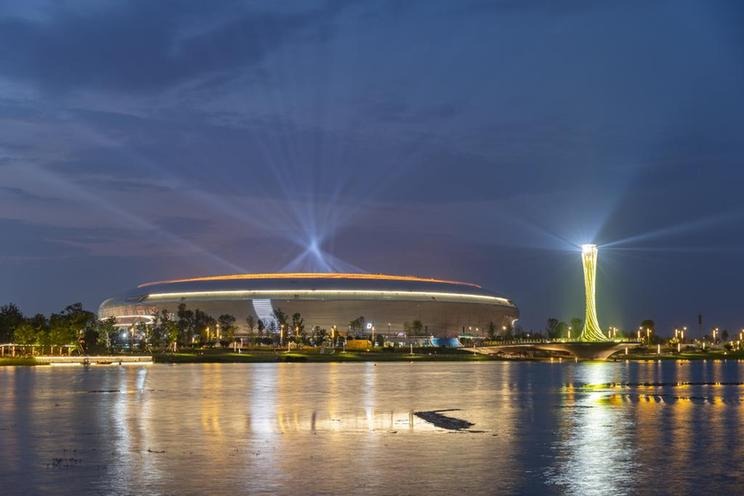 這是在成都市龍泉驛區拍攝的夜幕下的東安湖體育公園(7月18日攝)。新華社記者 黃偉 攝