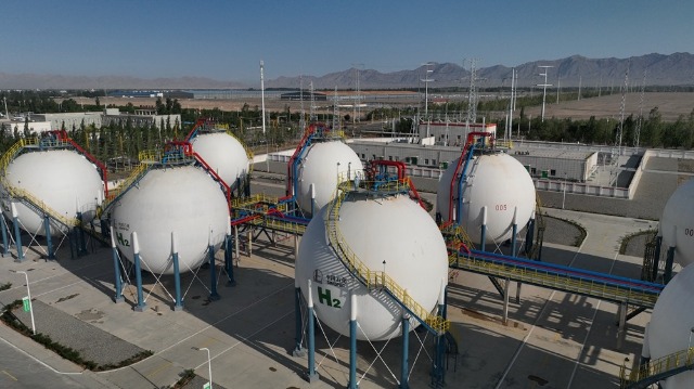 這是2023年6月30日拍攝的中國石化新疆庫車綠氫示范項目制氫廠儲氫罐區(無人機照片)。新華社記者 顧煜 攝
