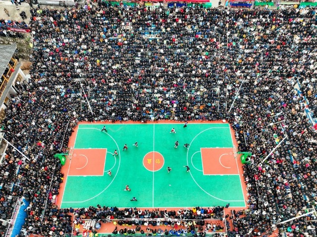 這是2023年3月27日在黔東南州臺江縣臺盤村拍攝的貴州省首屆“美麗鄉村”籃球聯賽總決賽比賽現場(無人機照片)。新華社記者 歐東衢 攝