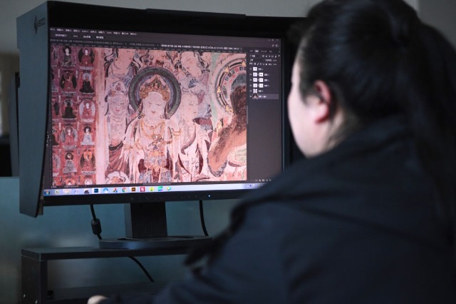 敦煌研究院文物數字化保護團隊圖像處理人員年海麗在拼接壁畫圖像(2023年4月25日攝)。數字化探索為莫高窟的保護與傳承開辟了全新路徑,數字技術讓敦煌文物走出洞窟,跨出國門,走向“永久保存、永續利用”。新華社記者 陳斌 攝