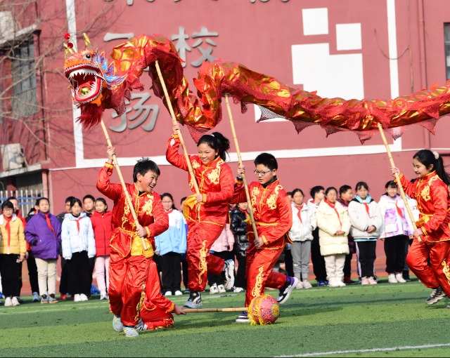 2月4日,安徽省合肥市瑤海區(qū)蚌埠路第二小學(xué)在校園里舉行傳統(tǒng)舞龍表演活動。蔣娟娟 攝