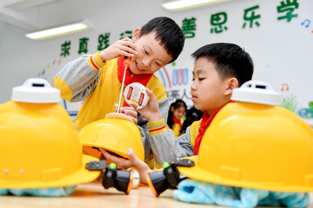 2022年11月24日,浙江省湖州市長興縣第二小學,小創客們正在自主設計、制作災難逃生安全帽科創小作品。通訊員 譚云俸 攝