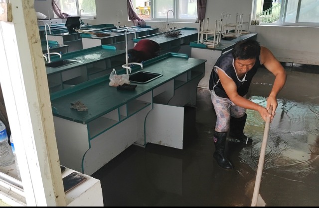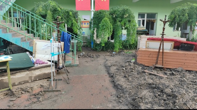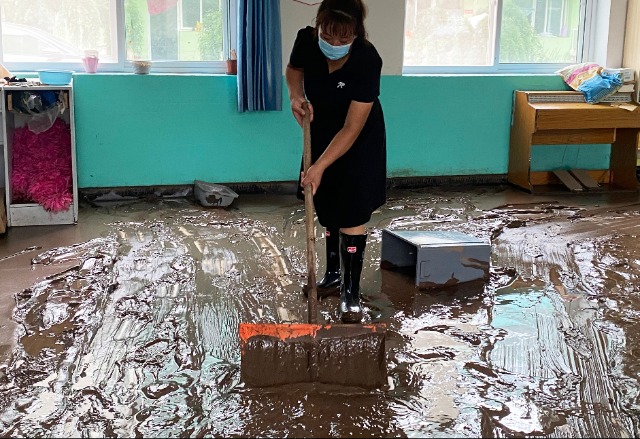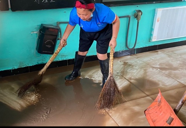 洪水退去后,其中口小學(xué)開展災(zāi)后自救。為了趕進(jìn)度,很多時(shí)候老師們加班到深夜,有時(shí)忙得連飯都顧不上吃。在清理學(xué)生宿舍的過程中,由于宿舍門檻高于地面,導(dǎo)致清理產(chǎn)生的污水掃不出去,老師們只能用鐵鍬和簸箕一下一下地鏟出去。烈日下,汗水浸濕了衣襟,泥漿沾滿了褲腿,教職工迎難而上,用汗水和行動(dòng)譜寫了人民教師的使命和擔(dān)當(dāng)。
