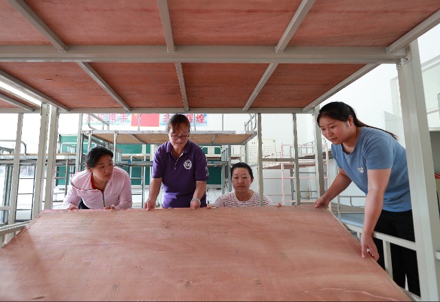 8月23日,其中口小學(xué)老師合力安裝學(xué)生上下床。