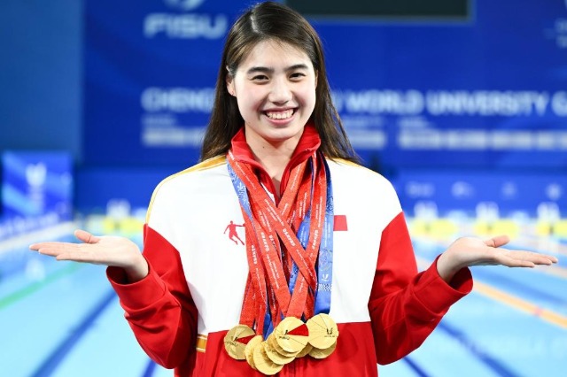 8月7日,參加成都大運會的張雨霏展示她獲得的九枚金牌。新華社記者 吳剛 攝