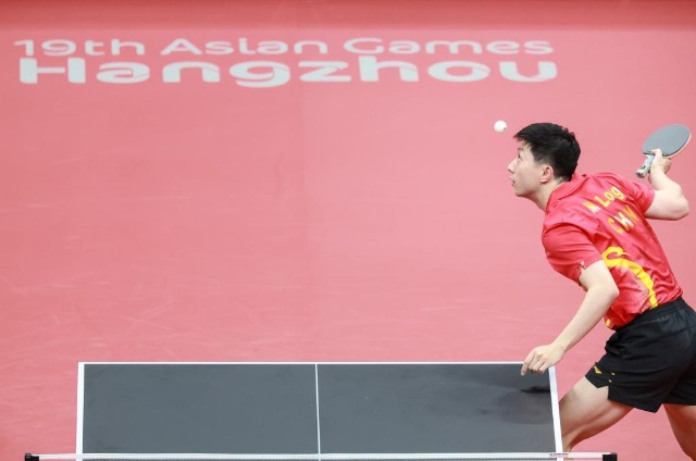 9月22日,中國隊選手馬龍在比賽中發球。新華社記者 劉續 攝