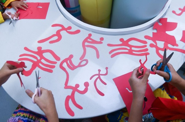 9月13日,孩子們在老師的帶領下創作亞運會運動項目的主題剪紙作品。新華社記者 徐昱 攝