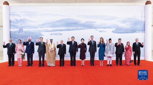 9月23日中午,國家主席習近平和夫人彭麗媛在浙江省杭州市西子賓館舉行宴會,歡迎來華出席杭州第19屆亞洲運動會開幕式的國際貴賓。這是習近平和彭麗媛同貴賓們合影留念。新華社記者 黃敬文 攝