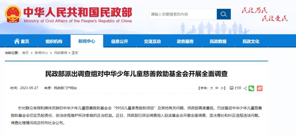 針對群眾舉報和媒體反映的中華少年兒童慈善救助基金會“9958兒童緊急救助項目”及其他有關問題,民政部高度重視,約談督促中華少年兒童慈善救助基金會切實負起責任,依法依規維護所涉家庭的正當權益。近日,民政部已派出調查組入駐該基金會開展全面調查,堅決查處和糾正違規違法問題。調查處理情況將及時向社會公布。
