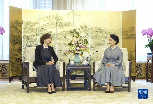 9月28日上午,國家主席習近平夫人、聯合國教科文組織促進女童和婦女教育特使彭麗媛在北京同聯合國教科文組織總干事阿祖萊共同出席2023年聯合國教科文組織女童和婦女教育獎頒獎儀式并分別發表致辭。這是頒獎儀式前,彭麗媛會見阿祖萊。新華社記者 丁林 攝