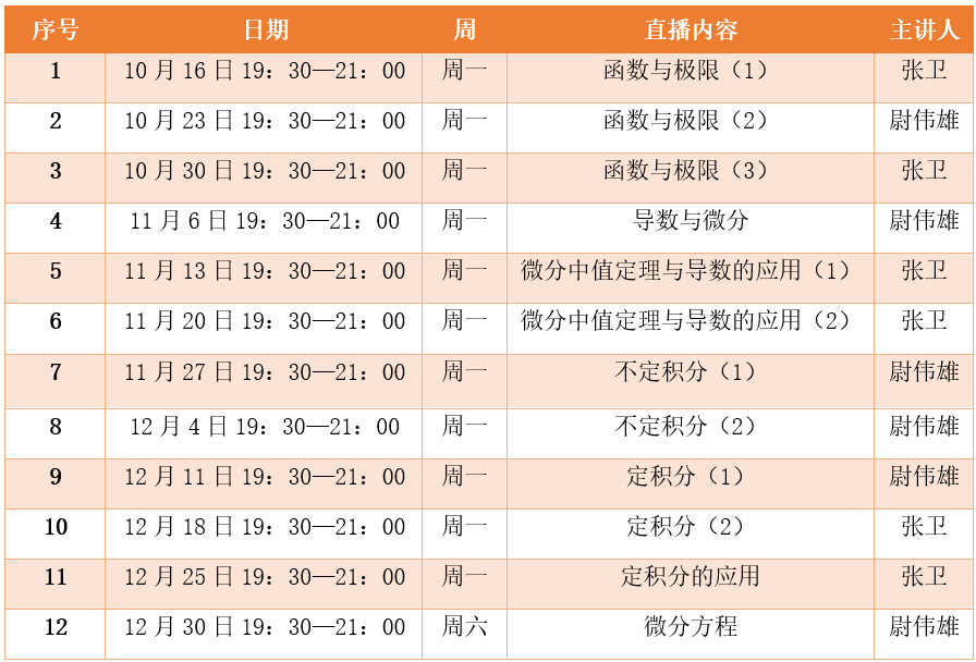 “高等數(shù)學重難點穿透輔導”系列直播課程內(nèi)容結(jié)合《同濟第八版 穿透輔導與習題全解》的知識要點與考點分析,對高等數(shù)學常考題型及重難點題型進行思路點竅,聯(lián)系考研數(shù)學實際提供多角度解題技法,重點突出,實用性強。直播課程特邀長期從事考研數(shù)學教學工作的張衛(wèi)與尉偉雄老師作為主講嘉賓,兩位老師也將在講解中密切結(jié)合考研數(shù)學大綱,為將來準備考研的同學提供專業(yè)的學習指南。因此,無論是為了把握高數(shù)重難點,還是為將來考研做準備,同學們都能從直播中獲益匪淺。