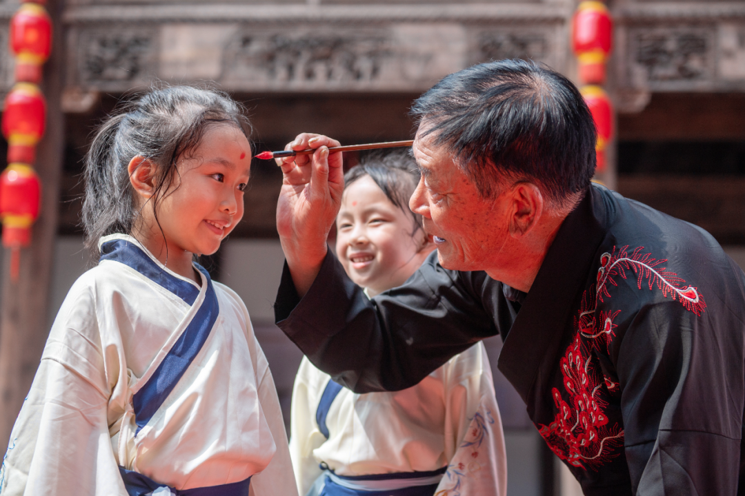 2023年8月17日,浙江省湖州市長興縣李家巷鎮(zhèn)石泉村文化禮堂,德高望重的老教師為孩子們朱砂啟智。通訊員 譚云俸 攝