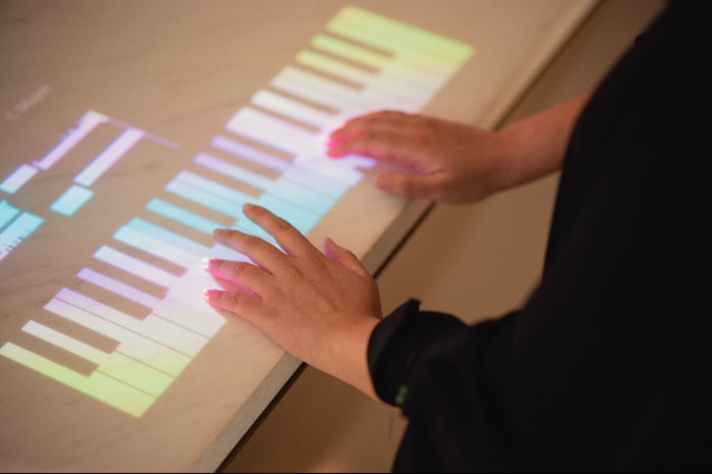 “印跡”設(shè)有兩個投影鍵盤,為不同年齡、不同音樂水平的觀眾提供簡短創(chuàng)作的機(jī)會,完成的作品會在多媒體墻面上以傳統(tǒng)五線譜的形式呈現(xiàn)出來,同時后臺還會將樂譜轉(zhuǎn)換成一段音頻,參觀者可以用手機(jī)掃描對應(yīng)的二維碼以保存或展示自己的創(chuàng)作。不僅如此,參觀者還可以在此創(chuàng)作視覺藝術(shù)作品,盡情發(fā)揮自己的想象力和創(chuàng)造力。