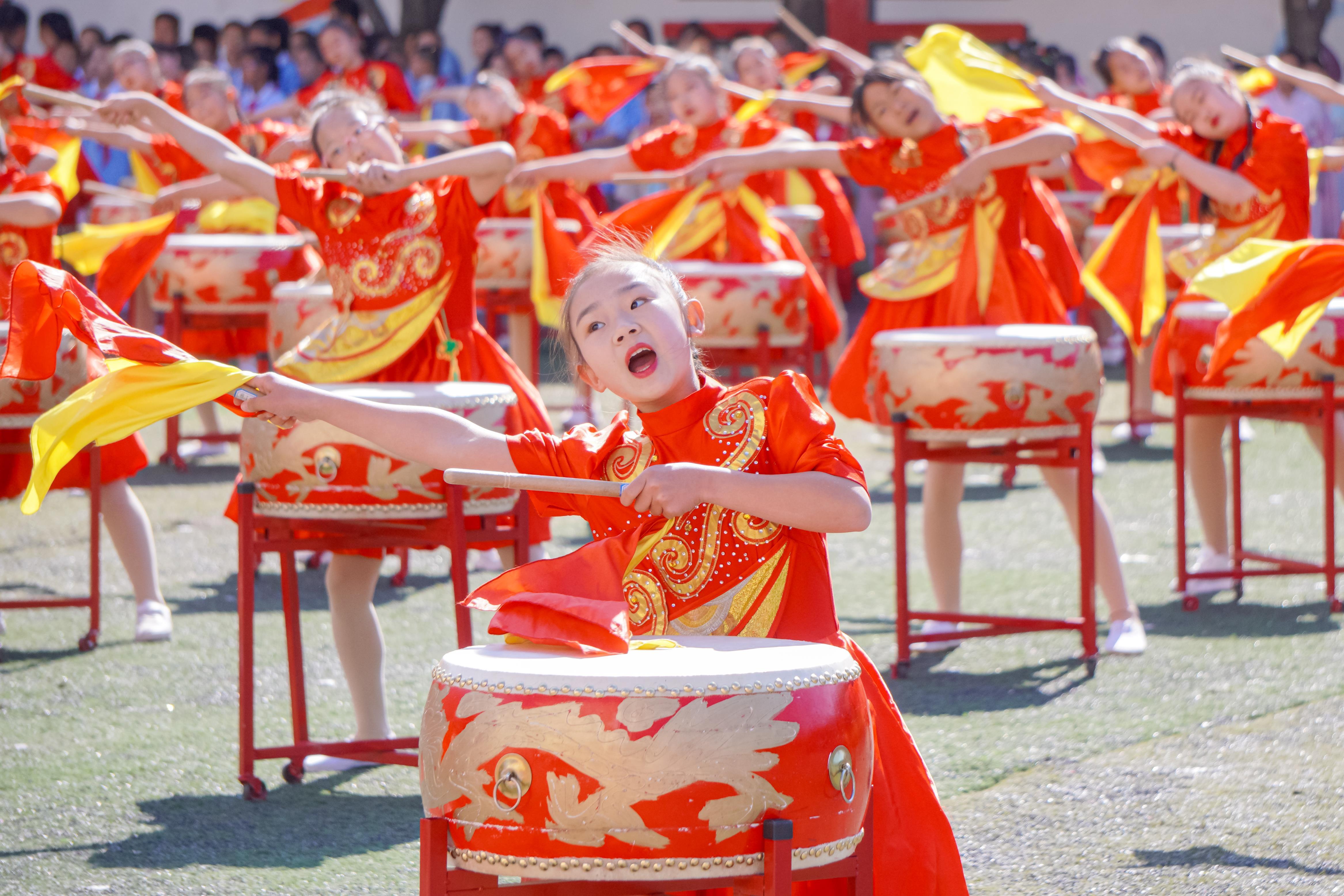 新疆維吾爾自治區昌吉市第八小學的學生在體育文化藝術節上進行打鼓表演。楊斌 攝