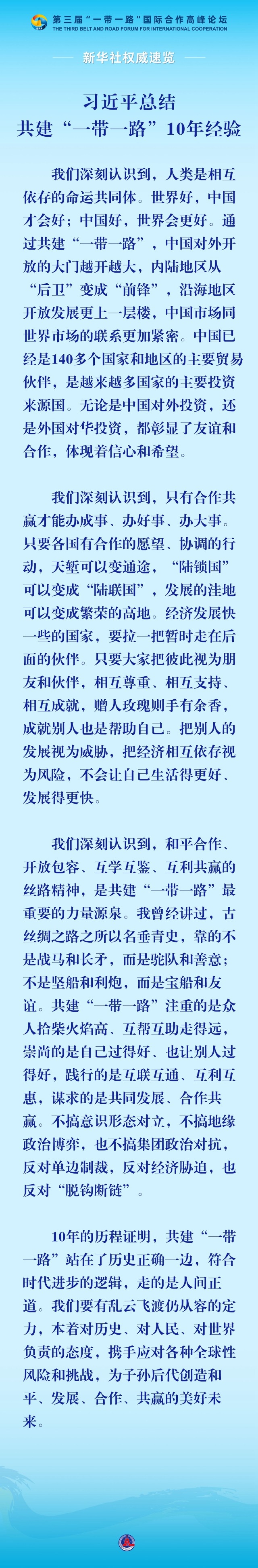 10月18日,國家主席習近平在第三屆“一帶一路”國際合作高峰論壇開幕式上發表主旨演講,總結了過去10年共建“一帶一路”的經驗。