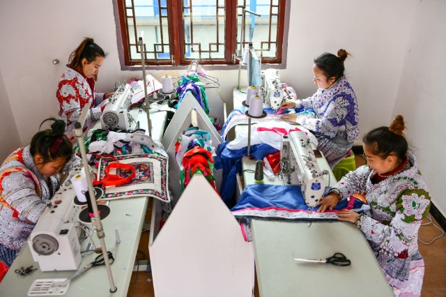 在貴州省畢節市黔西縣新仁苗族鄉化屋村,苗族繡娘們在制作苗族服飾(2021年2月20日攝)。新華社記者 楊文斌 攝