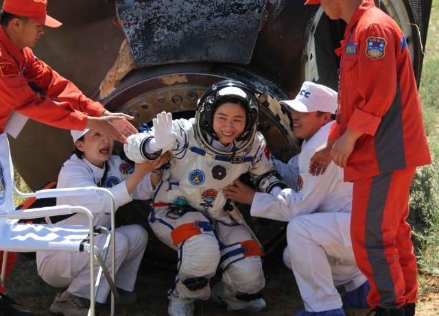 神舟九號飛船返回艙成功降落在位于內蒙古中部的主著陸場預定區域,航天員劉洋安全出艙(2012年6月29日攝)。新華社記者 王建民 攝