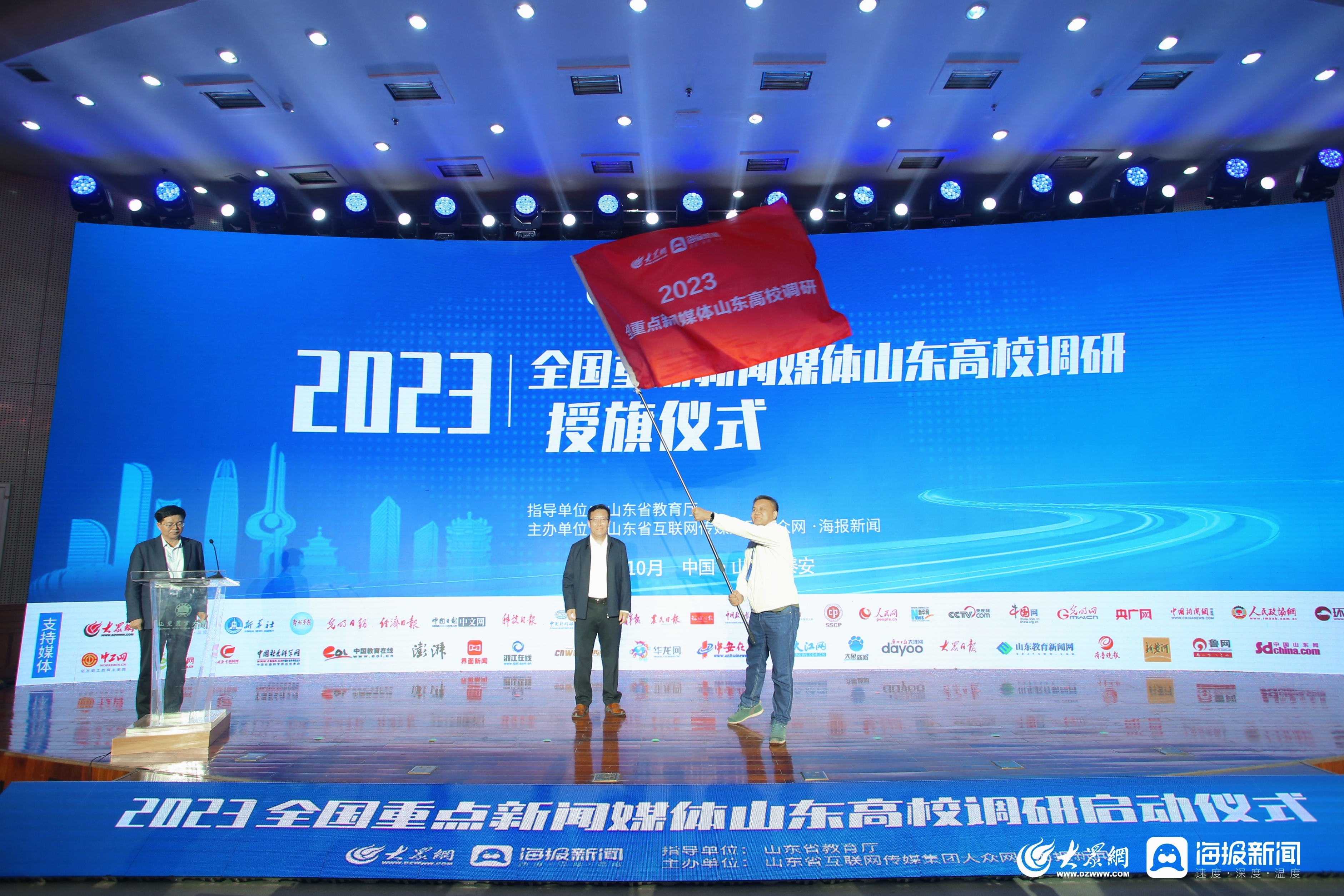 山東農業大學黨委書記徐劍波向參加2023全國重點新聞媒體山東高校調研行的媒體代表授旗,人民網山東頻道運營中心主任周建海作為媒體代表上臺接旗。2023全國重點新聞媒體山東高校調研行在山東農業大學正式啟動!