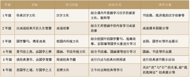 “936”校本課程側重于培養學生綜合素質,每類課程設計既兼顧年級差異,又注重前后的銜接與貫通。每學年9月是國學月,從一年級漢字中的國學,到二年級成語中的國學,一直到六年級學生進行思與行的辯論(見表1)。3月是讀書節,根據各年級語文教學和主題研究課的需要,為每個年級精選不同的書目,孩子們通過閱讀進行分享、寫作和應用拓展。6月是特色“六一”活動,一年級“職業體驗”,二年級“夜宿王府”,三年級“美食制作”,四年級“學軍”和“十歲成長禮”,五年級“游學”,六年級“義賣”。通過逐級遞進的校本課程,學生在傳統文化、閱讀素養、勞動技能等方面一步步積累、沉淀,讓綜合素質慢慢而扎實地提升。