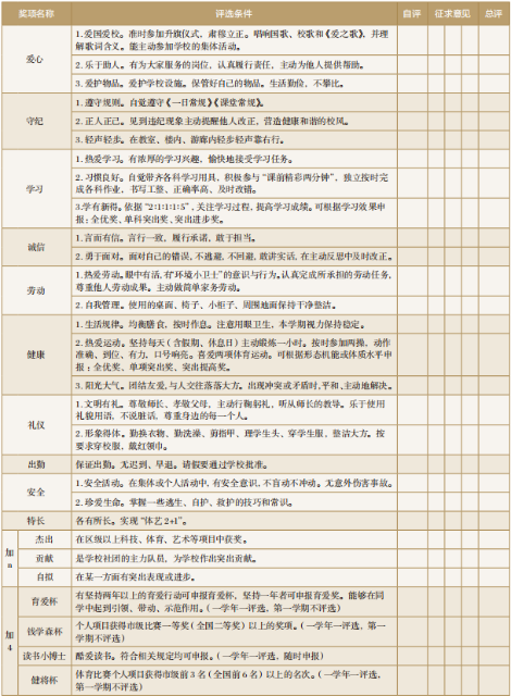 沒有賞識就沒有教育,每個孩子都有得到贊賞的渴望。期末“10+n+4”的評選(見表2),目的是為不同層面的學生提供得到賞識的機會,讓每個學生的閃光點都能被發現、發揚。一學期結束后,每個學生都會在10個方面開展自評和他評,包括愛心、守紀、學習、誠信、勞動、健康、禮儀、出勤、安全、特長等,每個方面都有相應的具體表現供學生參考。“+n”獎包括“杰出”獎,要求在區級以上科技、體育、藝術等項目中獲獎;“貢獻”獎要求是學校社團的主力隊員,為學校作出突出貢獻;如果在某一方面有突出表現或進步的則可以申報“自擬”獎。“+4”獎包括育愛杯、錢學森杯、讀書小博士、健將杯,分別針對學生的品德、能力、閱讀、體育等方面進行評選。上述獎項設計體現多層次、多維度的評價框架,同時針對學生的個性化學習與活動參與進行了特別的設計。評價體系中,沒有“最好”只有“更好”,目的是使每個孩子都能被看見,都能在未來創造出更多的可能性。