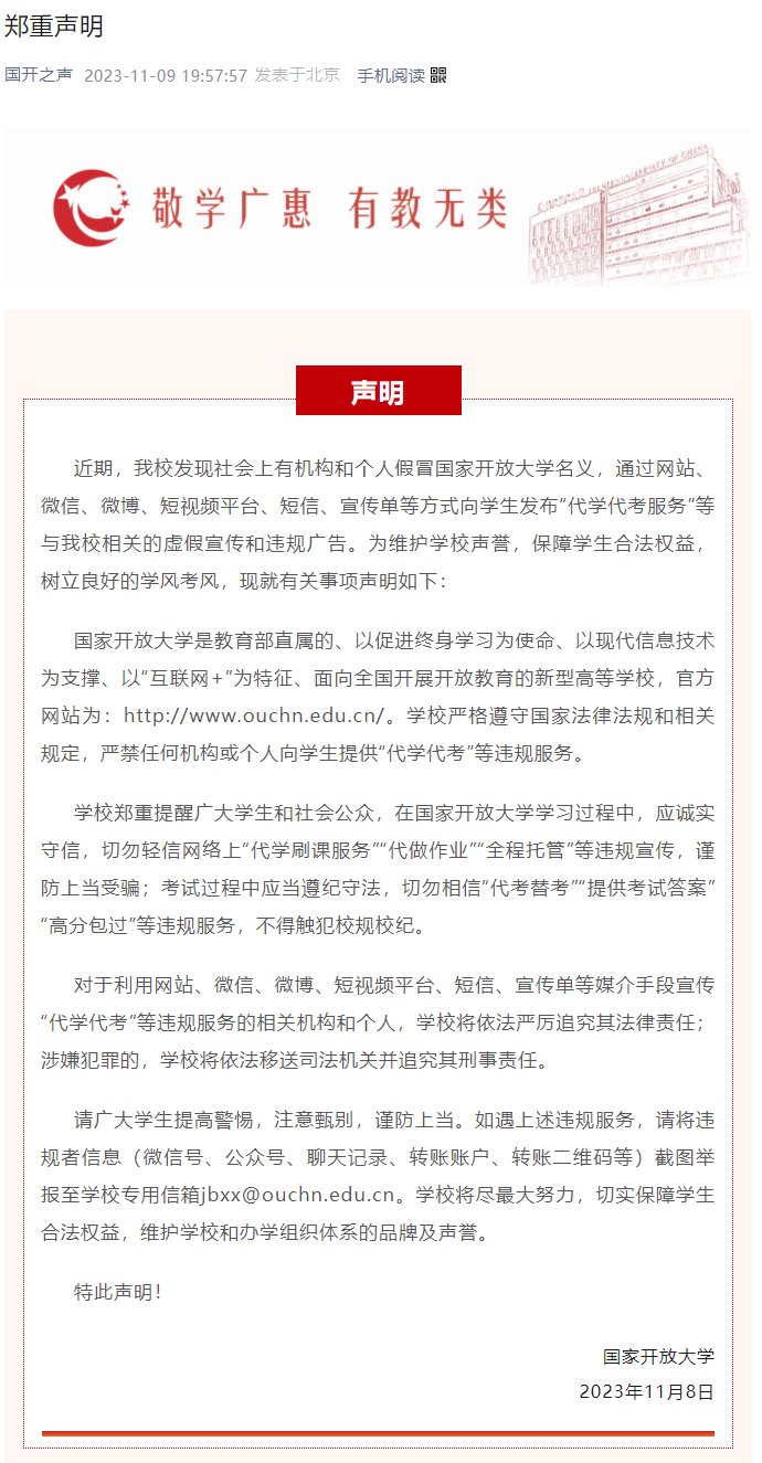 “國開之聲”微信公眾號11月8日發布鄭重聲明↓↓