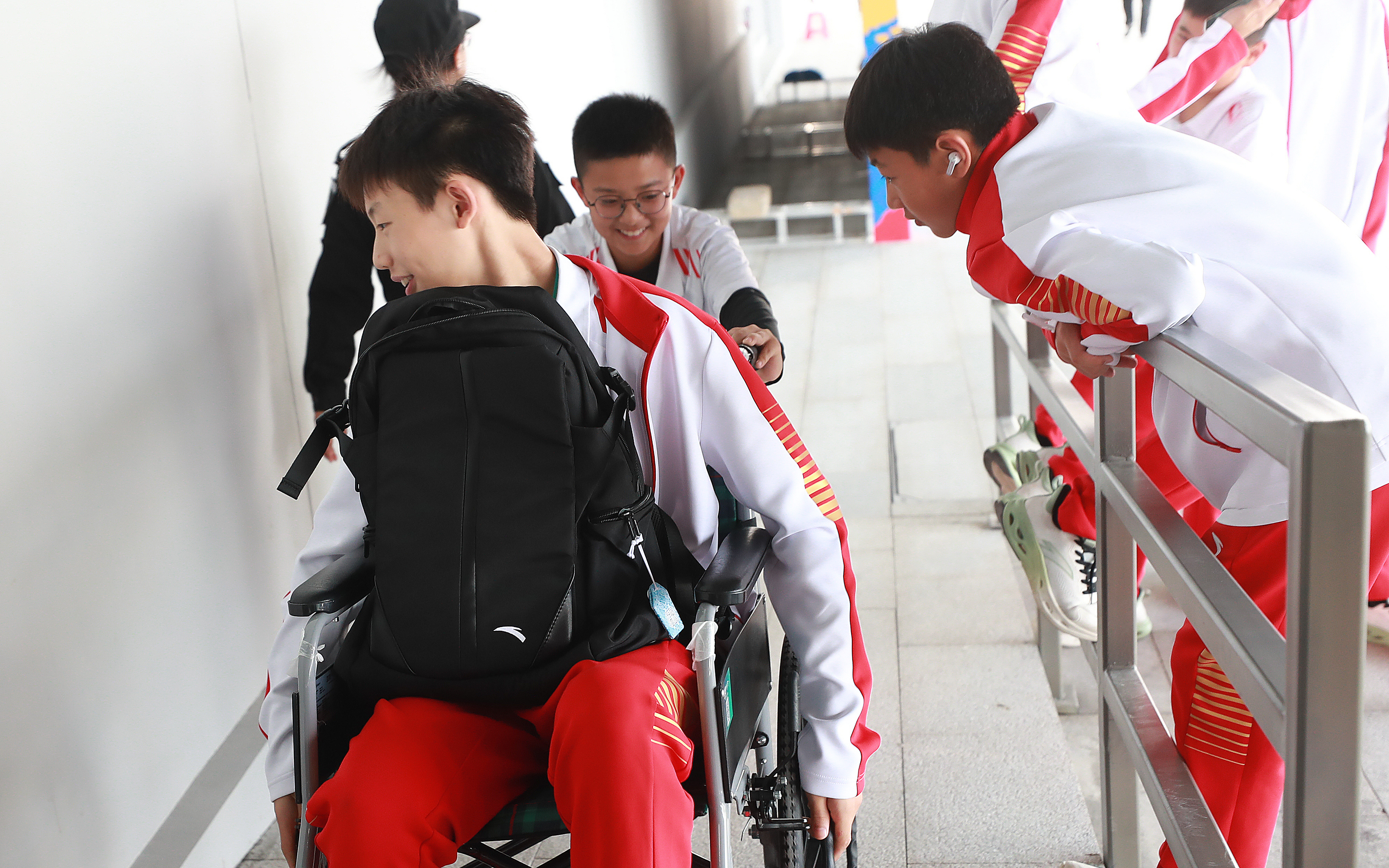 11月10日,第一屆學(xué)青會(公開組)輪滑項目男子輪滑球決賽在南寧進行。蘇州隊一名球員將隊友推到現(xiàn)場觀賽。
