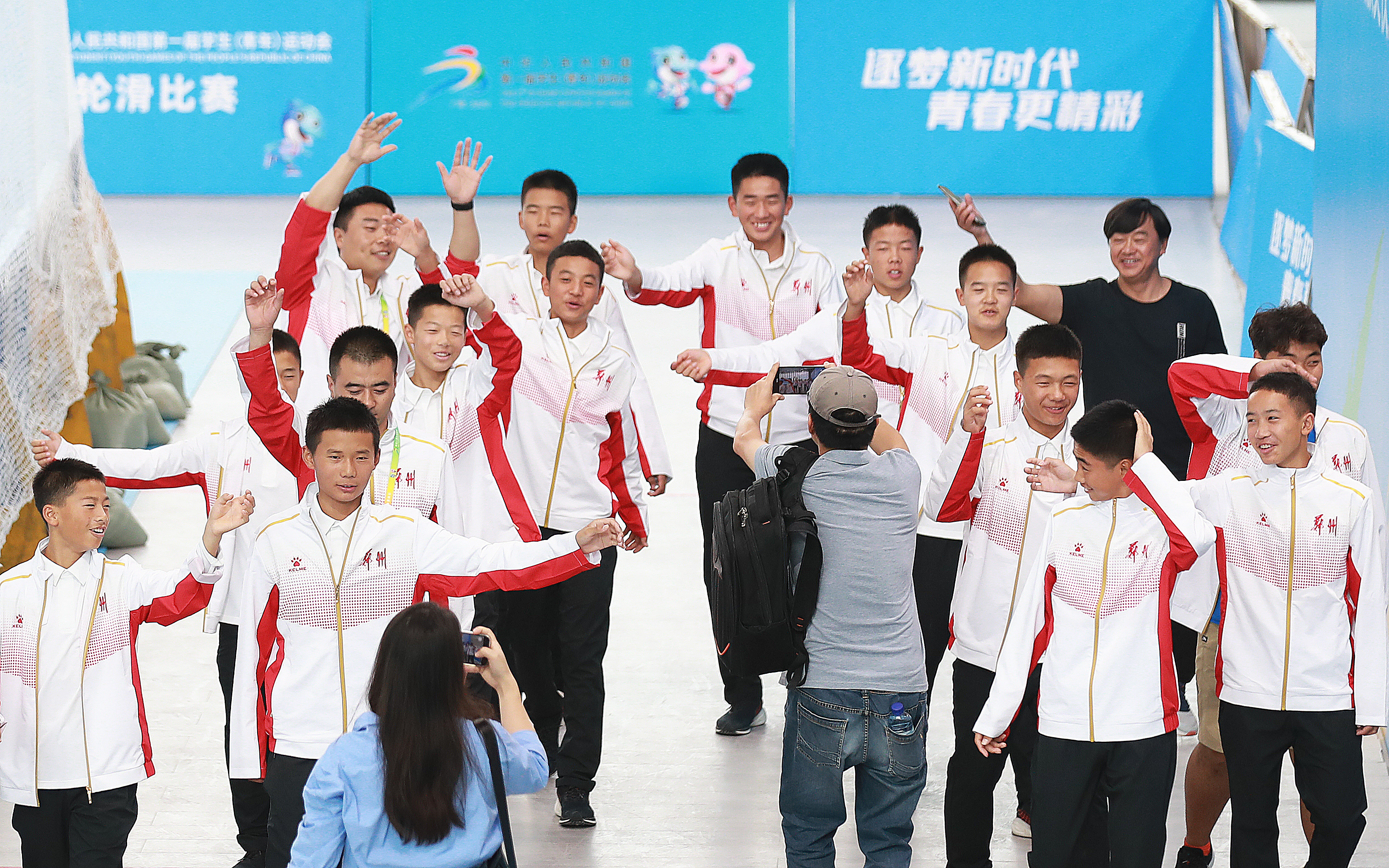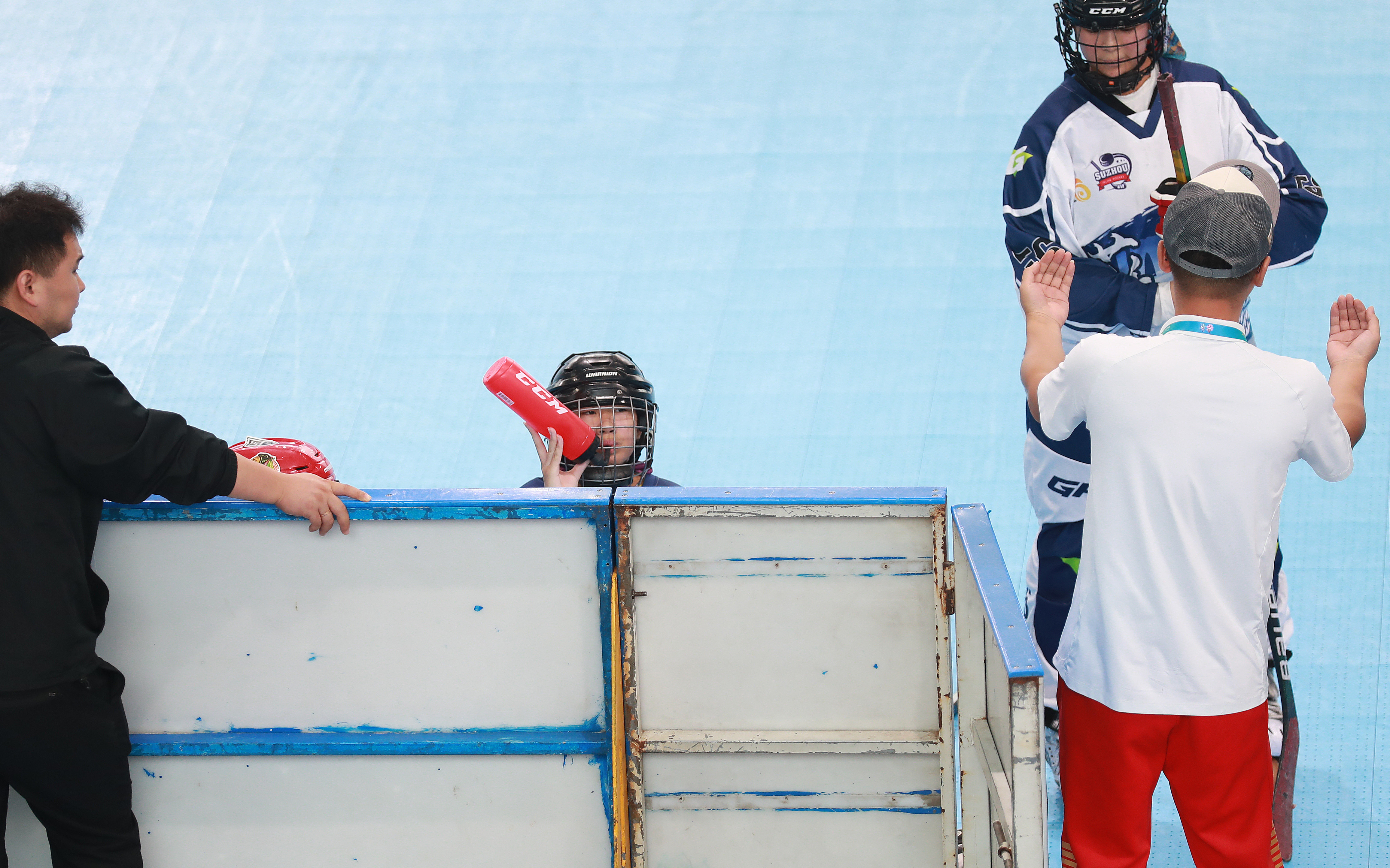 11月10日,第一屆學(xué)青會(公開組)輪滑項目男子輪滑球決賽在南寧進行,廣東廣州市隊3比0戰(zhàn)勝上海黃浦區(qū)隊獲得男子輪滑球冠軍。隊員們在慶祝勝利。廣州隊教練張國龍中場休息時現(xiàn)場指導(dǎo)。