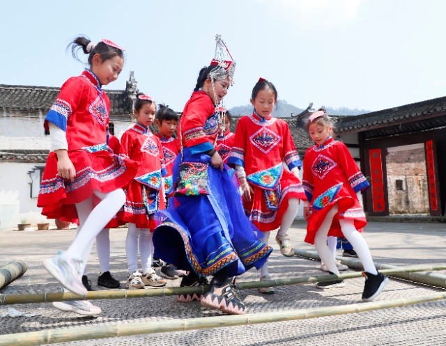 浙江省金華市武義縣實驗小學的畬族師生們深入俞源歷史古村落,身穿民族盛裝,體驗畬族傳統文體游戲、美食、歌曲。通訊員 連旭敏 攝