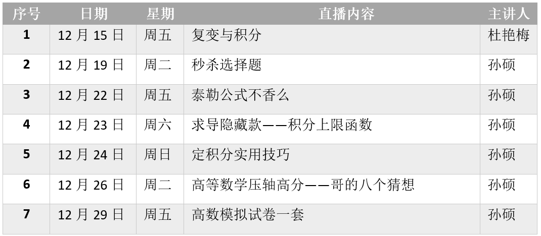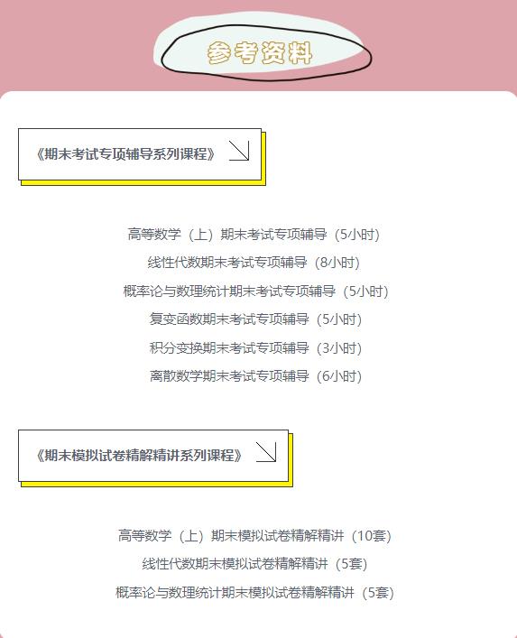 高等數學(上)期末專項輔導,針對期末高數考試重點、難點進行復習與強化,包括復變與積分、泰勒公式、定積分等六大必考考點以及一套模擬卷精講,共濃縮為七課時精華,直擊期末痛點。幫助同學們快速提分,取得佳績。直播課程特邀兩位深受大學生歡迎的數學名師——天津工業大學副教授孫碩與天津工業大學副教授杜艷梅作為主講嘉賓,兩位教師用多年教學經驗總結出一套針對高數的技法妙招,眾多學生從中受益。