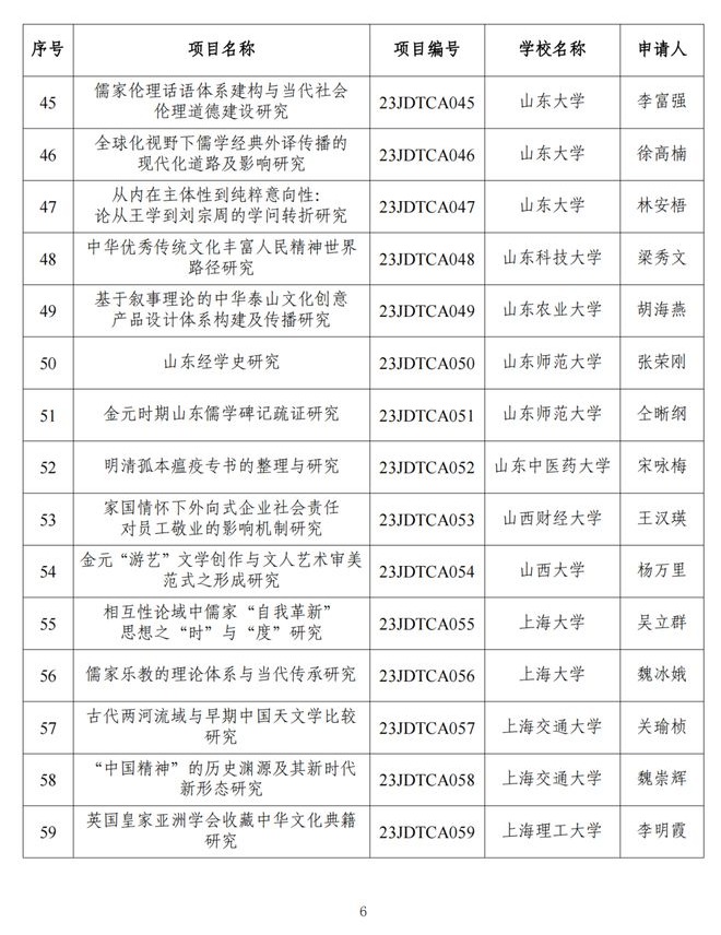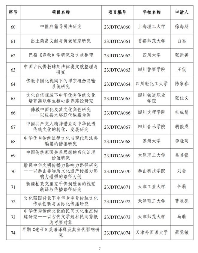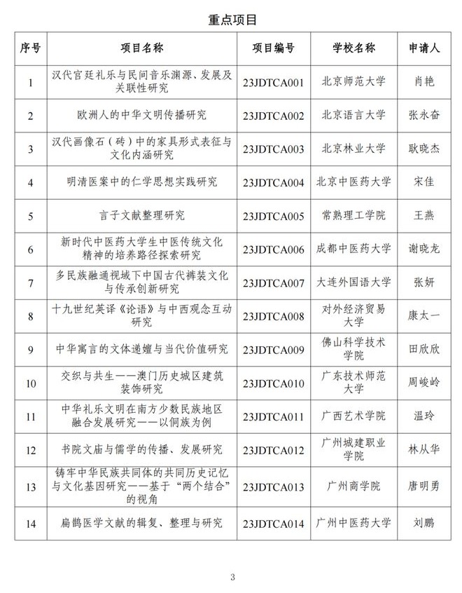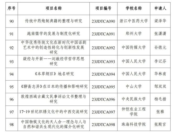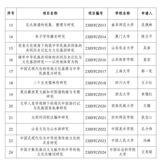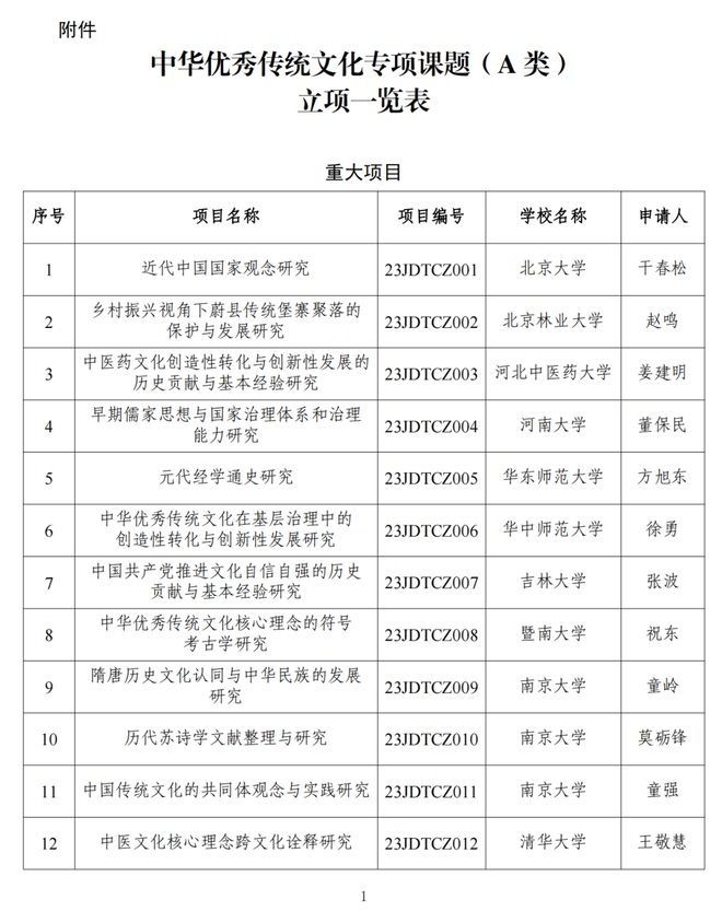 中華優秀傳統文化專項課題(A類)立項一覽表