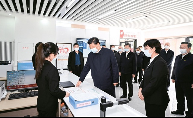 2023年5月10日,中共中央總書記、國家主席、中央軍委主席習近平在河北省雄安新區考察,并主持召開高標準高質量推進雄安新區建設座談會。這是10日上午,習近平在容東片區南文營社區黨群服務中心考察。 新華社記者 李學仁/攝