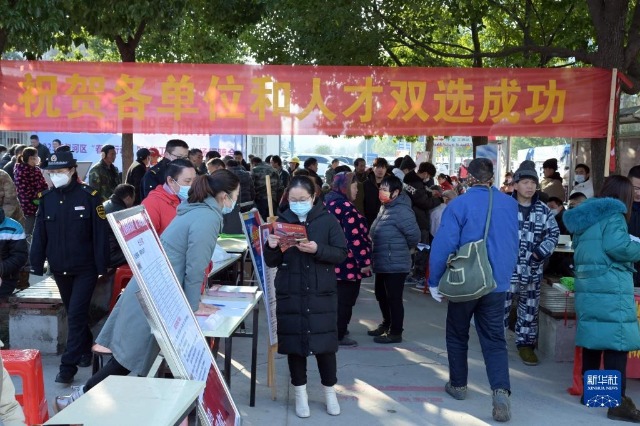 2023年2月15日,安徽省合肥市包河區在轄區內常青街道凌大塘臨工集散中心舉行春風行動暨“臨工就業”專場招聘會。這是求職者在招聘會上了解崗位信息。新華社記者 周牧 攝