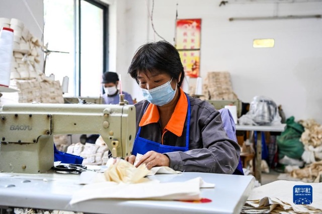 2023年11月30日,在貴港市港北區一家就業幫扶車間,當地群眾在加工勞保用品。新華社記者 曹祎銘 攝