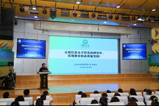 翠微小學教育集團黨委書記、校長張國立作報告。學校供圖