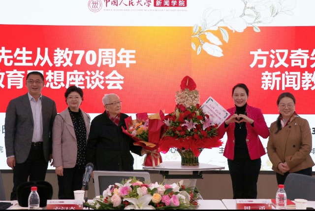 中央民族大學新聞與傳播學院榮休教授白潤生,華中科技大學新聞與信息傳播學院原院長吳廷俊,南京師范大學新聞與傳播學院教授倪延年,清華大學新聞與傳播學院黨委書記胡鈺,中國傳媒大學新聞學院院長隋巖,湖南師范大學新聞與傳播學院原院長尹韻公,清華大學新聞與傳播學院教授郭鎮(zhèn)之、李彬,中國文史出版社原總編輯胡太春,中國人民大學新聞學院教授涂光晉等特邀嘉賓和弟子代表圍繞方先生從教70周年的經(jīng)歷和新聞教育思想進行交流研討,表達對方先生的尊敬和祝福。